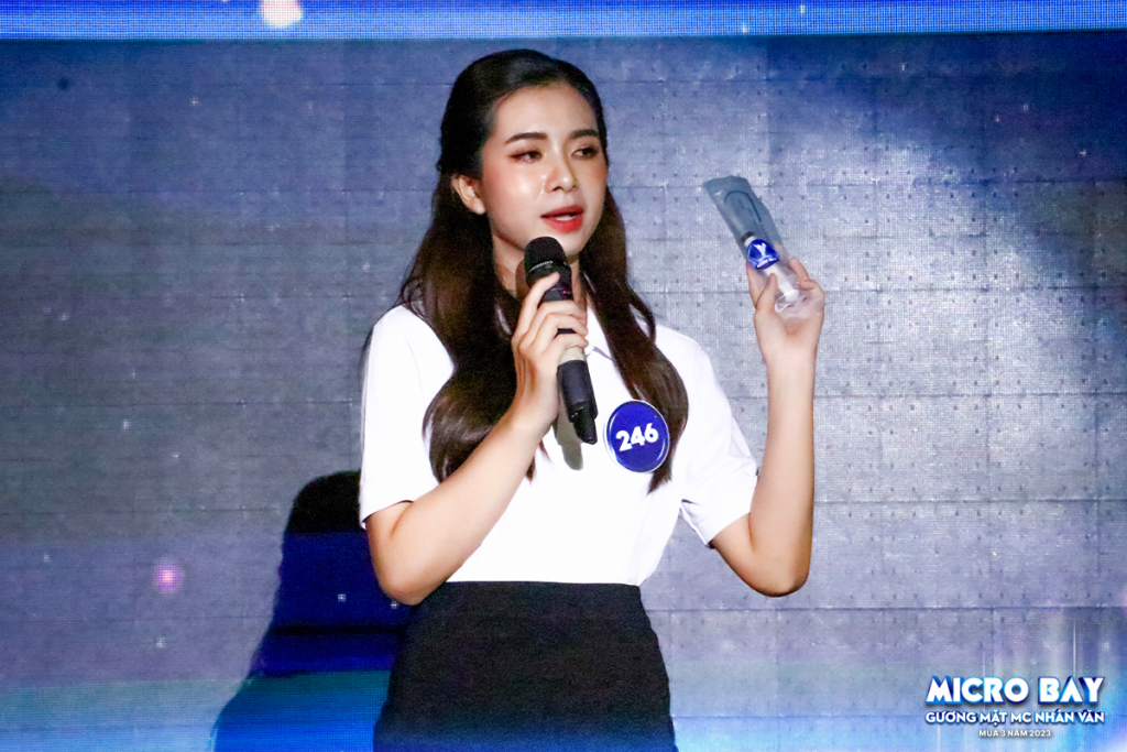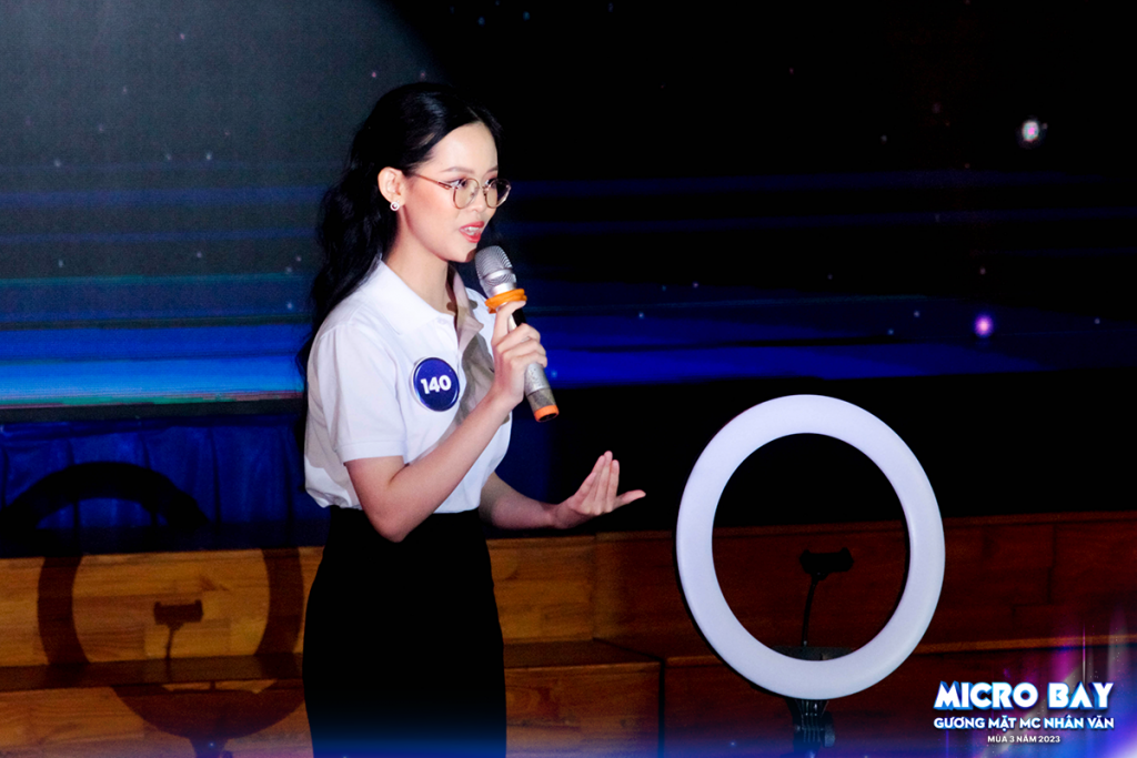 Thí sinh Triệu Gia Uyên duyên dáng với phần dự thi dẫn chương trình “Ký ức vui vẻ” – KỂ MỘT THỜI – NHỚ MỘT ĐỜI và thuyết trình về điện thoại để lại nhiều cảm xúc trong lòng khán giả. Nguồn: BTC MICRO BAY – Gương mặt MC Nhân văn