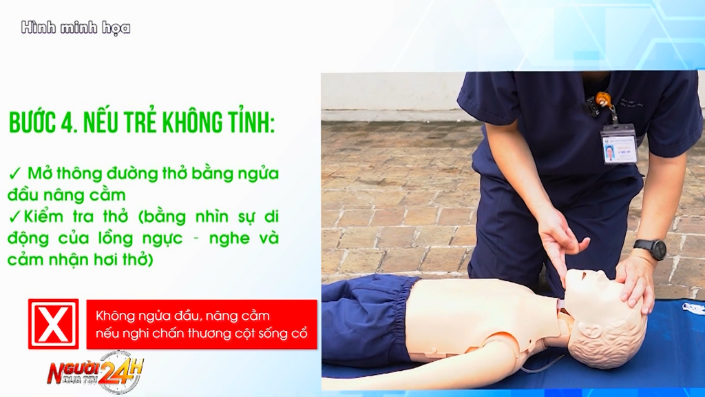 “Chính vì thế mà chúng ta mất thời gian dốc ngược trẻ chạy vòng quanh, có nghĩa là chúng ta lỡ mất 1 vài phút thôi nhưng là thời gian cực kỳ quan trọng để chúng ta cứu nạn nhân. Cái thứ 2 là đã ngừng tim ngừng thở rồi, nhưng trường hợp chưa ngừng thở và có thể nhịp tự thở được, mà cái việc chúng ta dốc ngược lên như thế thì tất cả chất dịch, nước trong dạ dày, thức ăn thì trào ngược trở lại.”