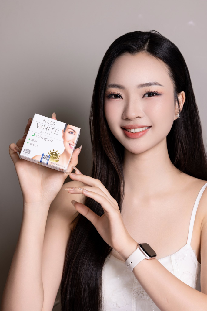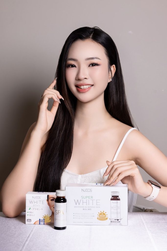 Thí sinh Trịnh Vũ Hồng Duyên rạng rỡ bên cạnh Nucos White – sản phẩm hỗ trợ làm sáng da đến từ thương hiệu Nucos Nhật Bản
