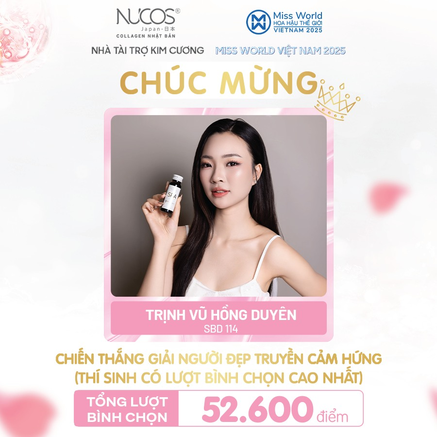 Với tổng giá trị giải thưởng lên đến 20 triệu đồng, chiến thắng này không chỉ là sự ghi nhận cho hành trình nỗ lực mà còn mở ra cơ hội để Hồng Duyên đồng hành cùng Nucos trong các chiến dịch truyền thông, tiếp tục lan tỏa hình ảnh người phụ nữ hiện đại – tự tin, đầy rạng rỡ, và biết yêu thương chính mình,