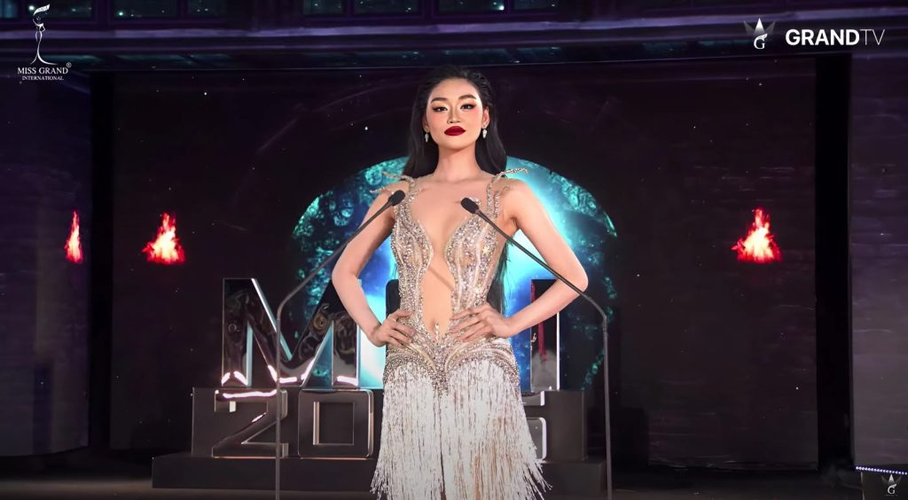 Ở phần đầu, thí sinh Miss Grand International 2025 lần lượt giới thiệu bản thân và trình diễn trang phục dạ hội tự chọn. Hoa hậu Yến Nhi diện thiết kế bắt mắt của NTK Thượng Gia Kỳ. Bộ trang phục được đính kết cầu kỳ, điểm nhấn tua rua lấp lánh tạo hiệu ứng chuyển động, tôn vóc dáng và vẻ gợi cảm. Cô nhận được nhiều lời khen với layout tóc uốn vuốt ngược, son môi đỏ. Phần trang điểm và làm tóc đều do Yến Nhi tự thực hiện, cho thấy sự khéo léo và chủ động của người đẹp khi chinh chiến quốc tế.