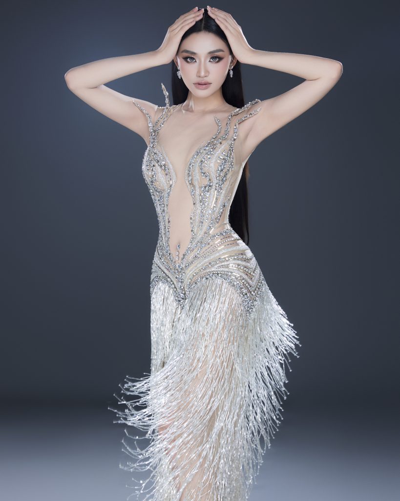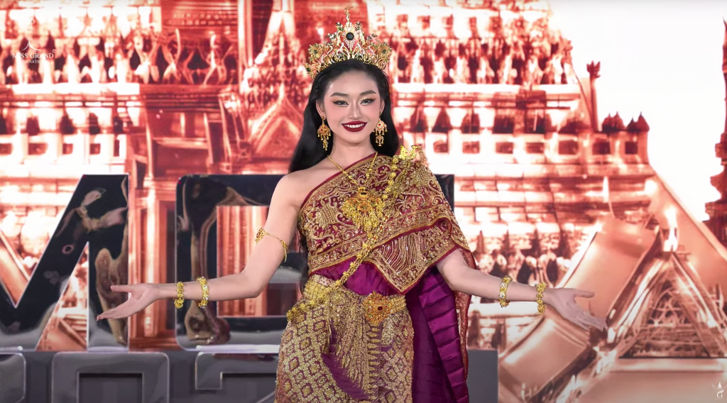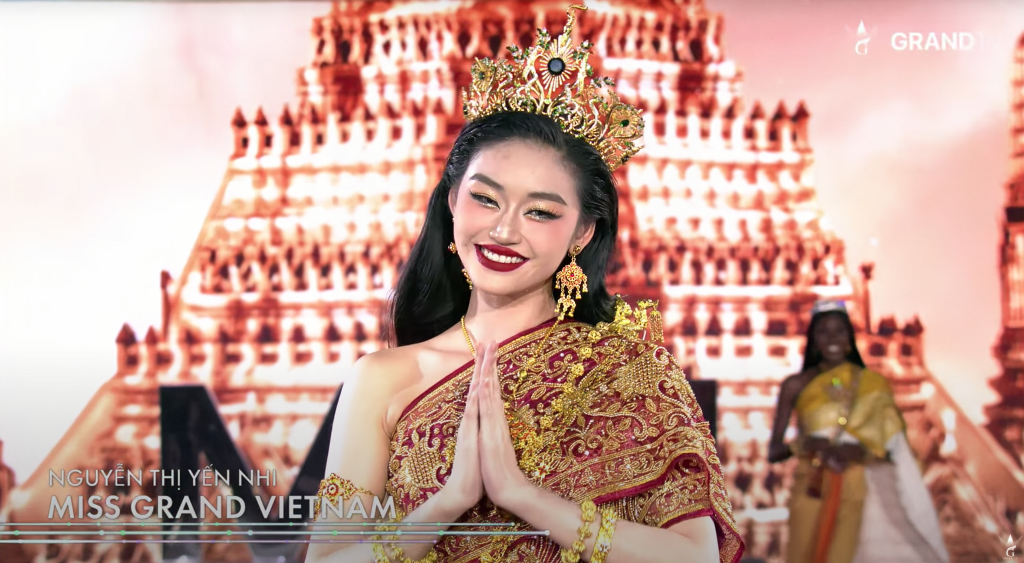 Ngay sau đó, Hoa hậu Yến Nhi cùng dàn thí sinh bước vào phần trình diễn trang phục truyền thống Thái Lan do ban tổ chức chuẩn bị. Đại diện Việt Nam xuất hiện với thiết kế quấn chéo vai, mang tông màu tím chủ đạo kết hợp hoạ tiết màu vàng cầu kỳ, sang trọng. Hoa hậu Yến Nhi đội vương miện “Solara Aurelia – Hồng Nhật Kim Quang”, bước đi kiêu sa và quyền quý.