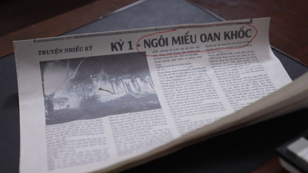 Ngày hôm sau, ông Lâm nhìn thấy tờ báo đăng kỳ đầu tiên của loạt truyện “Ngôi miếu oan khốc” đặt trên bàn làm việc, tiêu đề được khoanh đỏ nên vô cùng hoang mang, sợ hãi.