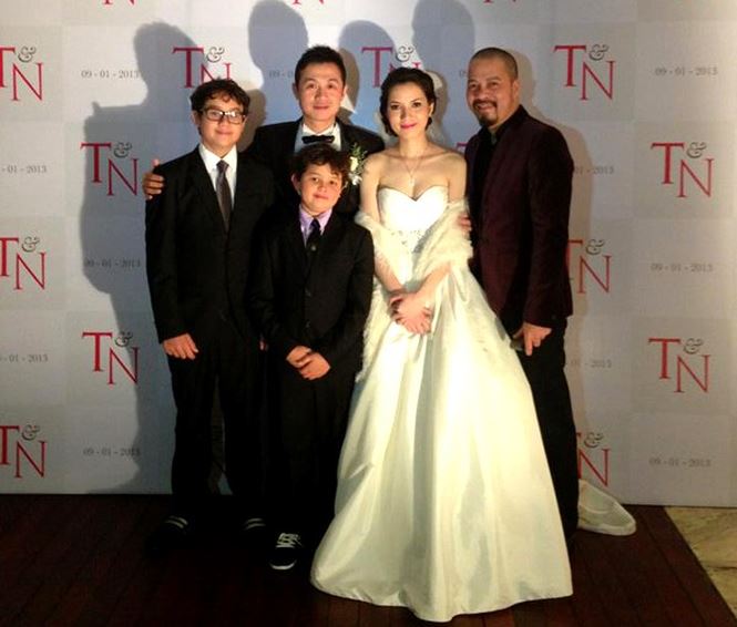 Alex và Henry diện âu phục bảnh bao dự đám cưới của bố Anh Tuấn và mẹ kế Hồng Nhung vào đầu năm 2013.