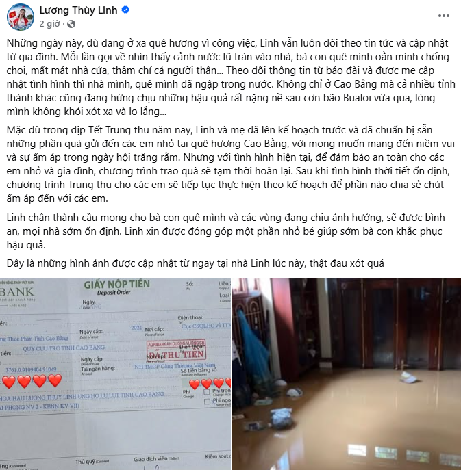 Ngày 01/10/2025, Hoa hậu Lương Thùy Linh đăng tải trên trang cá nhân chia sẻ nỗi lòng khi chứng kiến hình ảnh ngập lụt tại quê nhà Cao Bằng, đồng thời thông báo việc tạm dừng chương trình trao quà Trung thu để đảm bảo an toàn cho các em nhỏ.