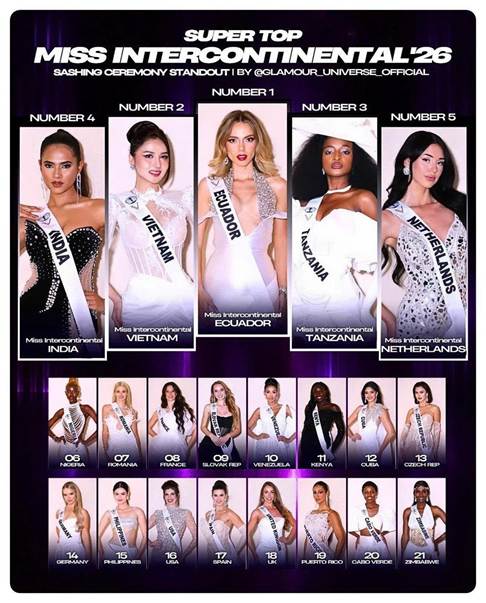 Bên cạnh sự đầu tư chỉn chu về trang phục trong từng vòng thi, Á hậu Thu Ngân còn ghi dấu ấn rõ nét trên các bảng đánh giá của nhiều chuyên trang sắc đẹp quốc tế. Tại lễ trao sash, đại diện Việt Nam được xếp vào nhóm thí sinh có phần xuất hiện nổi bật nhất, liên tục góp mặt trong các danh sách “Best Sashing Ceremony Dress” và “Standout Contestants” do các trang theo dõi Miss Intercontinental thực hiện. Đặc biệt, Thu Ngân được đưa vào Top cao của bảng xếp hạng tổng hợp, sánh vai cùng những đại diện mạnh đến từ Ecuador, Tanzania, Netherlands hay India. Việc được các chuyên trang quốc tế đánh giá tích cực cho thấy hình ảnh và phong độ của Thu Ngân không chỉ dừng lại ở yếu tố trang phục, mà còn đến từ thần thái, kỹ năng trình diễn và sự chuẩn bị nghiêm túc trong suốt hành trình tại Miss Intercontinental 2025.