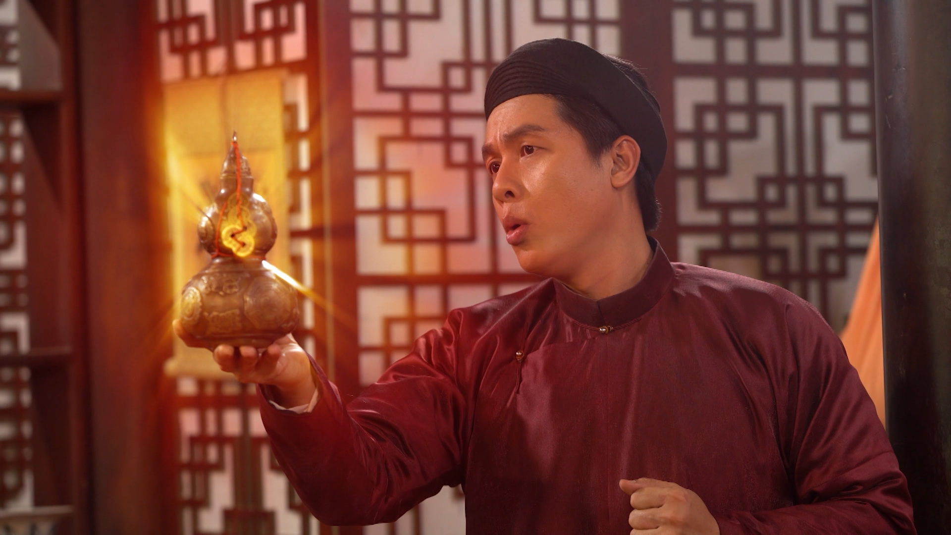 “Duyên tiên tiền định” tập 2 – Giữa lúc Phạm Trung vẫn đang bị giam trong hồ lô thì nơi trần gian, thiếu gia Minh Thành (cũng do Hòa Hiệp thủ vai) liên tục nợ nần vì cờ bạc, lại còn báo hại vợ chồng em trai…