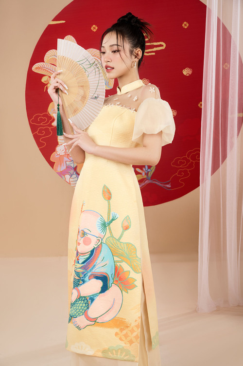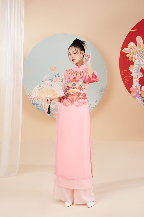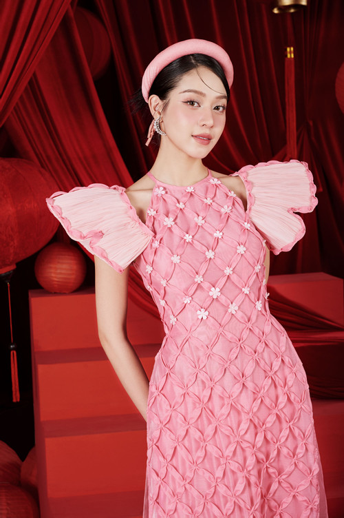Trên nền những phom dáng hiện đại như tay bồng, vai đắp xuyên thấu, tay hến hay đính kết nơ… Lê Ngọc Lâm sử dụng kỹ thuật sắp xếp dàn đều, đính kết 3D các chi tiết như cánh hoa, cánh bướm, hình đồng xu hay họa tiết tranh Đông Hồ, nhằm giúp thiên nhiên, vẻ đẹp ngày Tết được hiện lên đầy thơ mộng.