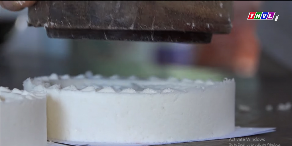 Để làm ra được chiếc bánh in, trước hết là rang nếp, xay thành bột mịn, chuối được phơi khô sấy thành sợi trộn chung với gừng xắt sợi rồi bắt đầu xào lên chảo với đường đến khi nặng tay thì trộn thêm mè và để nguội rồi cho đậu phộng được rang vàng để làm nhân bánh,… Sau đó, người thợ dùng khuôn gỗ có khắc hình ảnh hoa văn rồng, phụng,… rất đẹp để tạo hình bánh. Vì vậy, khi chiếc bánh làm ra trên bề mặt của từng chiếc bánh in có hoa văn làm tăng thêm vẻ đẹp tinh tế, hài hòa. Hình ảnh chạm khắc trên khuôn bánh in cũng thể hiện khát vọng vươn xa, mạnh mẽ của bà con nơi đây.