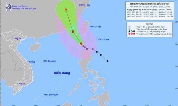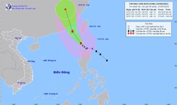 Theo Trung tâm Dự báo khí tượng thuỷ văn quốc gia, bão Doksuri đã giảm cấp. Lúc 1h ngày 27/7, vị trí tâm bão trên vùng biển phía Tây Bắc đảo Luzon (Philippines). Sức gió mạnh nhất vùng gần tâm bão mạnh cấp 14 (150-166km/giờ), giật trên cấp 17.