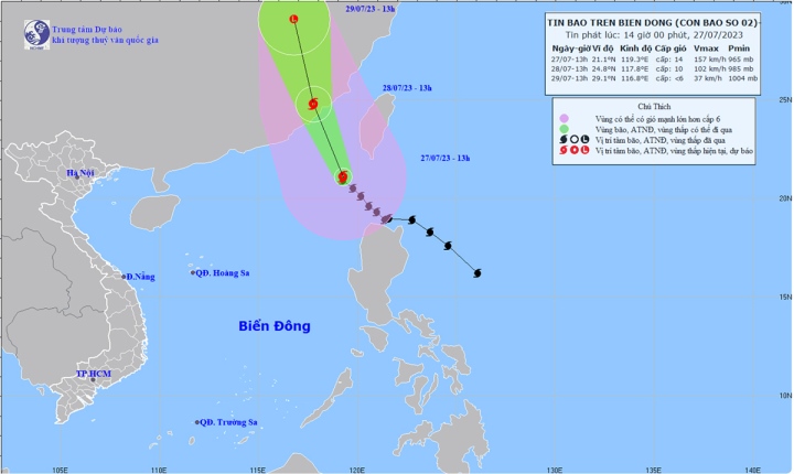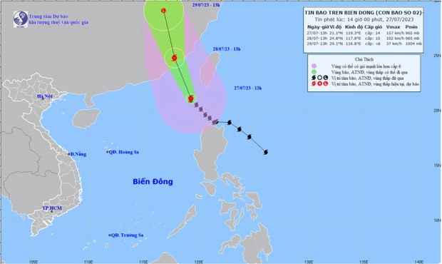 Cụ thể, Trung tâm Dự báo khí tượng thuỷ văn quốc gia cho biết, lúc 13h ngày 27/7, vị trí tâm bão số 2 cách Sán Đầu (Trung Quốc) khoảng 370km về phía Nam Đông Nam. Sức gió mạnh nhất vùng gần tâm bão mạnh cấp 13 (134-149km/giờ), giật cấp 16.