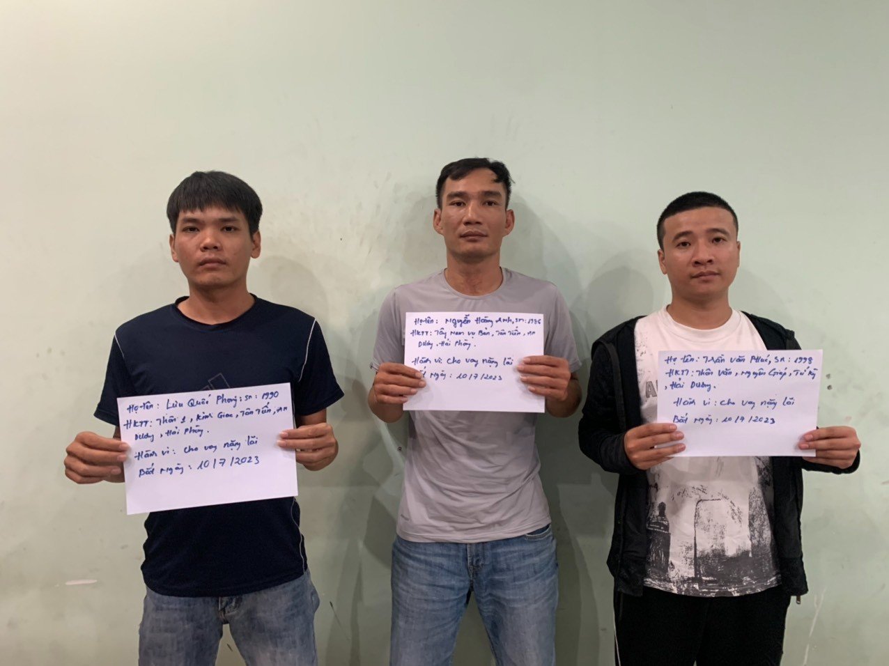 Trước đó, Phòng Cảnh sát hình sự Công an tỉnh Bình Dương triển khai kế hoạch phòng, chống tội phạm liên quan tín dụng đen, đã phát hiện Nguyễn Hoàng Anh (37 tuổi), Lưu Quốc Phong (33 tuổi, cùng ngụ Hải Phòng) và Trần Văn Phúc (25 tuổi, ngụ Hải Dương) có biểu hiện cho vay nặng lãi.