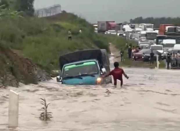 Nước dâng cao trên mặt đường cao tốc, đoạn sâu nhất gần 1m. Nhiều tài xế không dám lưu thông qua đoạn đường bị ngập. Một số xe tải cố gắng chạy qua và bị tắt máy, ngập đến nửa thân xe rồi trôi dạt vô lề, mắc kẹt chờ cứu hộ.