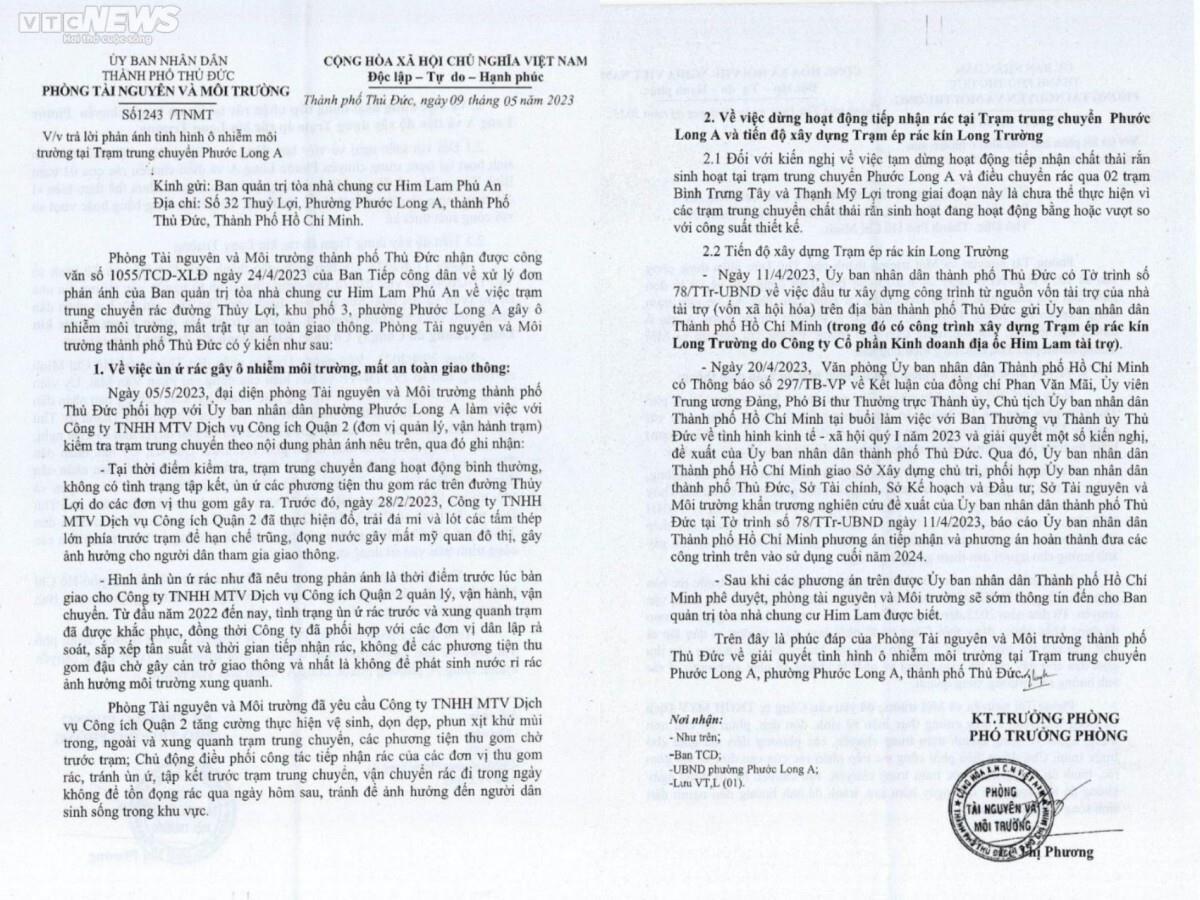 Liên quan phản ánh của người dân về tình trạng trên, phía Phòng Tài nguyên và Môi trường TP Thủ Đức cho biết, đã nắm được thông tin và đang trong quá trình xử lý. Trước đó, tháng 5/2023, Phòng Tài nguyên và Môi trường TP Thủ Đức phối hợp cùng đại diện UBND phường Phước Long A làm việc với đơn vị quản lý Trạm trung chuyển rác Phước Long. Theo báo cáo của Phòng Tài nguyên và Môi trường, tại thời điểm kiểm tra Trạm trung chuyển hoạt động bình thường và không xảy ra tình trạng ô nhiễm.