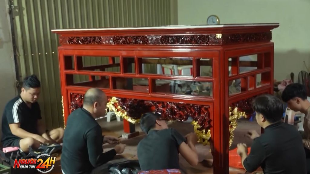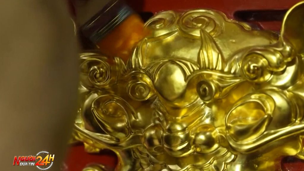 Khi dát vàng, người thợ dùng chổi thép tóc chuyên dụng, nhẹ nhàng áp từng lá vàng lên bề mặt, lau và miết thật khéo để vàng bám chắc vào các hoa văn chạm trổ tinh xảo.