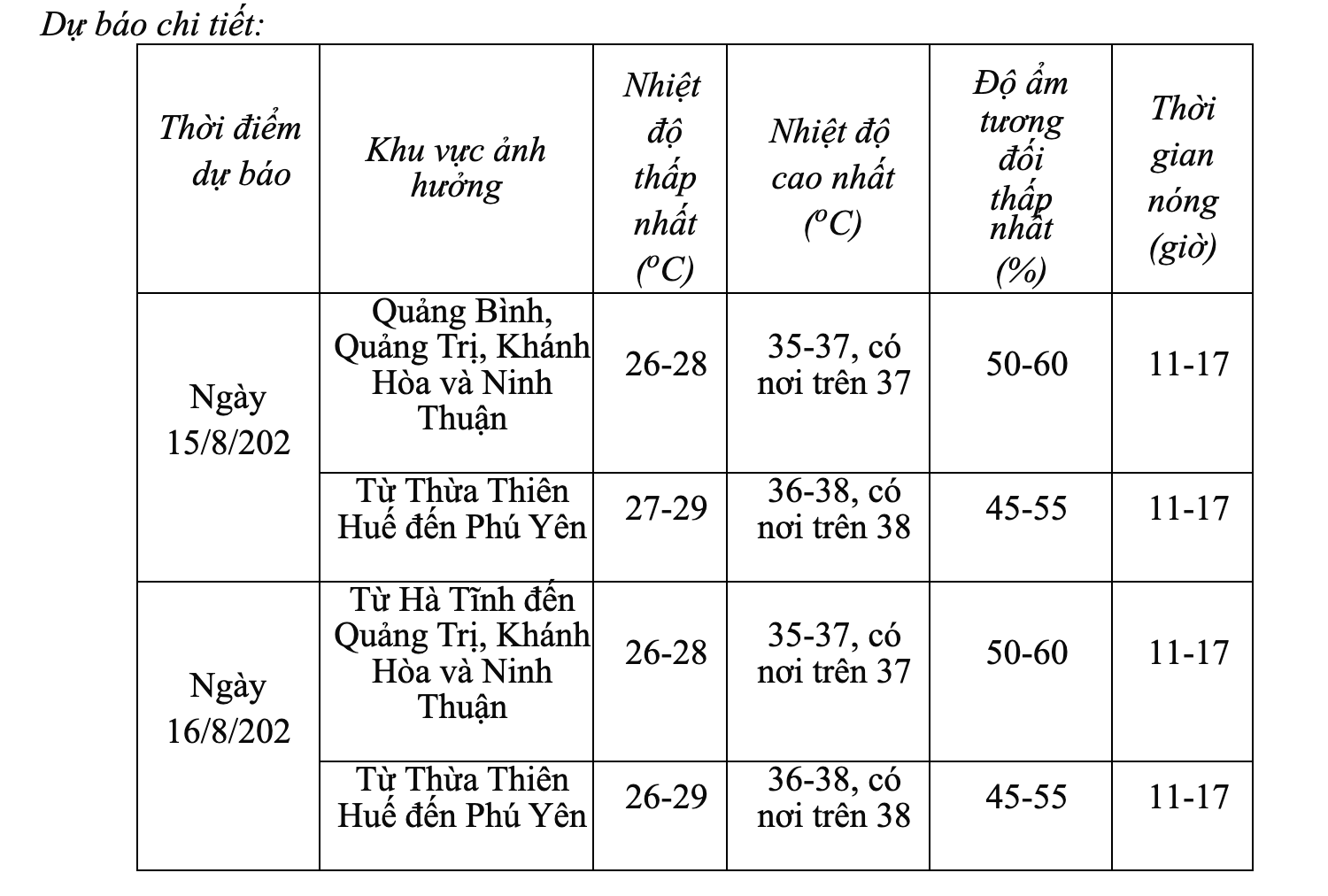 Dự báo, ngày15 – 16.8, ở khu vực từ Hà Tĩnh đến Ninh Thuận có nắng nóng, có nơi nắng nóng gay gắt với nhiệt độ cao nhất phổ biến 35 – 37 độ C, có nơi trên 37 độ C; riêng khu vực từ Thừa Thiên – Huế đến Phú Yên có nắng nóng và nắng nóng gay gắt với nhiệt độ phổ biến 36 – 38 độ C, có nơi trên 38 độ C. Độ ẩm tương đối thấp nhất phổ biến 45 – 60%.