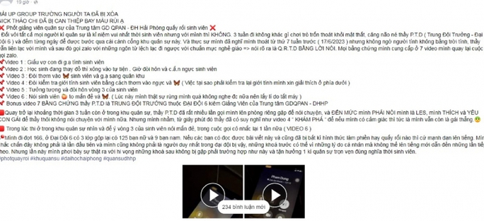 Trước đó, như Báo Người Lao Động đã đưa tin, vào tối 22-6, trên group của sinh viên Trường ĐH Hải Phòng, tài khoản T.C. có đăng tải bài viết thông tin về việc giảng viên quân sự của Trung tâm GDQPAN nhiều lần gọi điện, quấy rồi nữ sinh viên và kèm theo 7 đoạn ghi âm có nội dung trao đổi giữa 2 người nam và nữ.