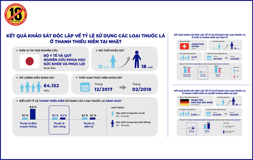 Hiện đã có 184/193 quốc gia thành viên của WHO hợp pháp hóa thuốc lá làm nóng. Nhiều nghiên cứu tại Nhật, Đức, Thụy Sĩ cho thấy tỷ lệ giới trẻ sử dụng sản phẩm này chỉ dưới 2%.